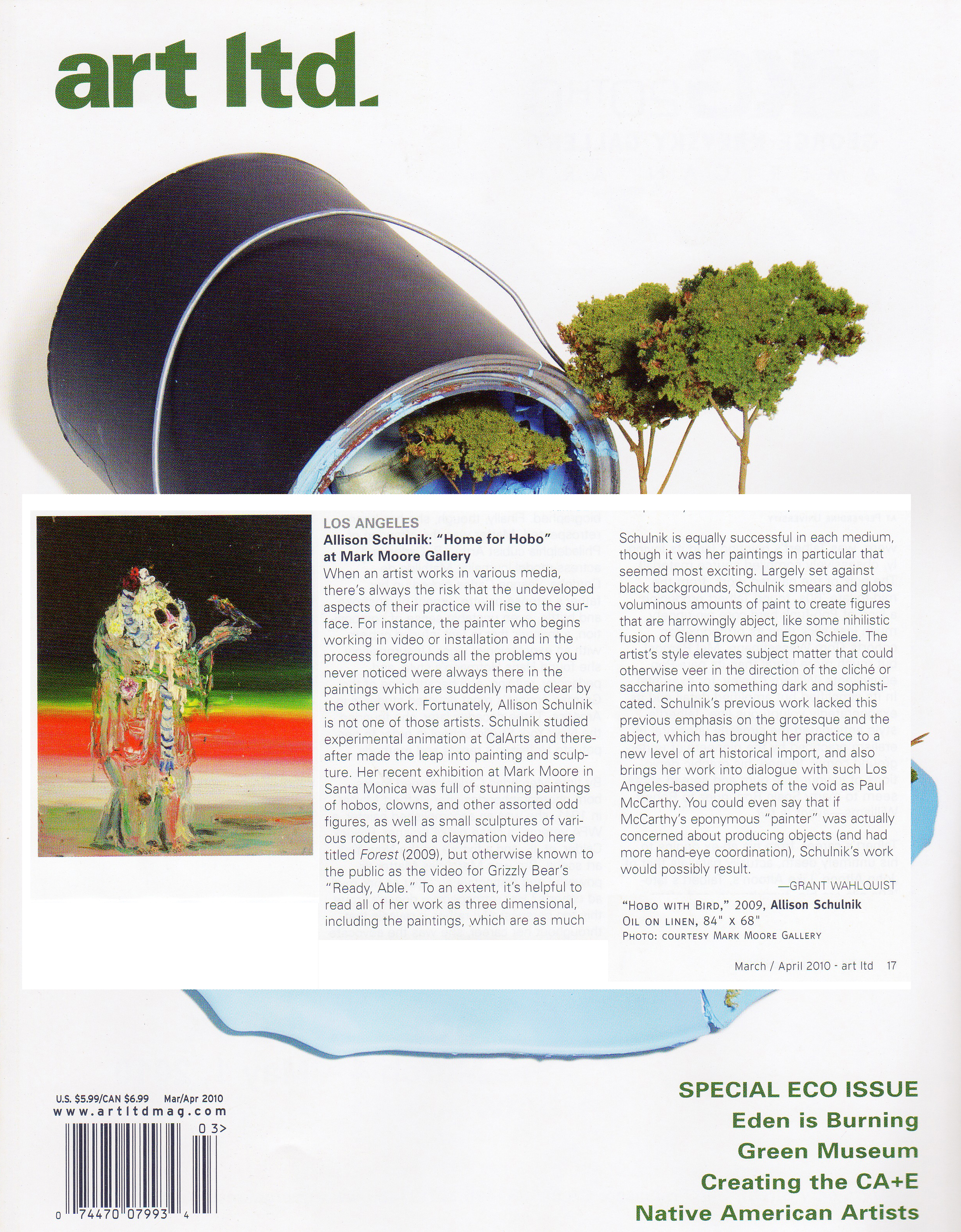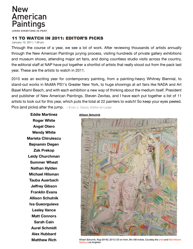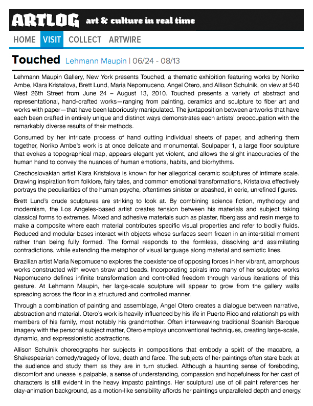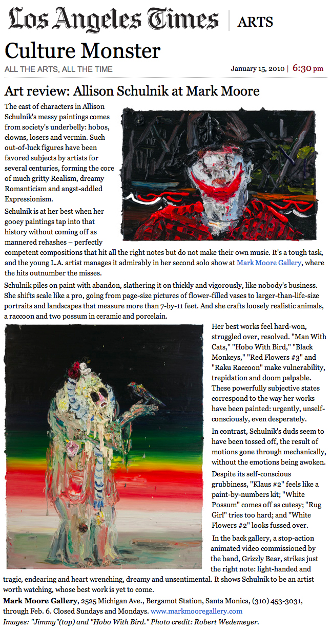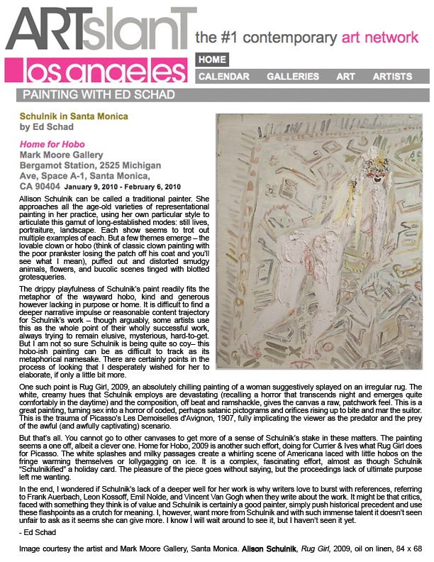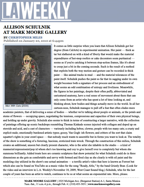Solo exhibitions include the Wadsworth Atheneum Museum of Art, Hartford, CT; Laguna Art Museum, Laguna Beach, CA; Oklahoma City Museum of Art, OK; Nerman Museum of Contemporary Art, Overland Park, KS; Mark Moore Gallery, Los Angeles; ZieherSmith, New York, NY; and Galeria Javier Lopez & Fer Frances, Madrid. Schulnik's work is in the public collections of the Los Angeles County Museum of Art; Museum of Contemporary Art San Diego; Santa Barbara Art Museum; Museé de Beaux Arts (Montreal); Laguna Art Museum; The Crocker Art Museum; Wadsworth Atheneum Museum of Art; and The Albright-Knox Gallery; Marjorie Barrick Museum (University of Nevada Las Vegas)- to name but a few. She lives and works in Sky Valley, CA.