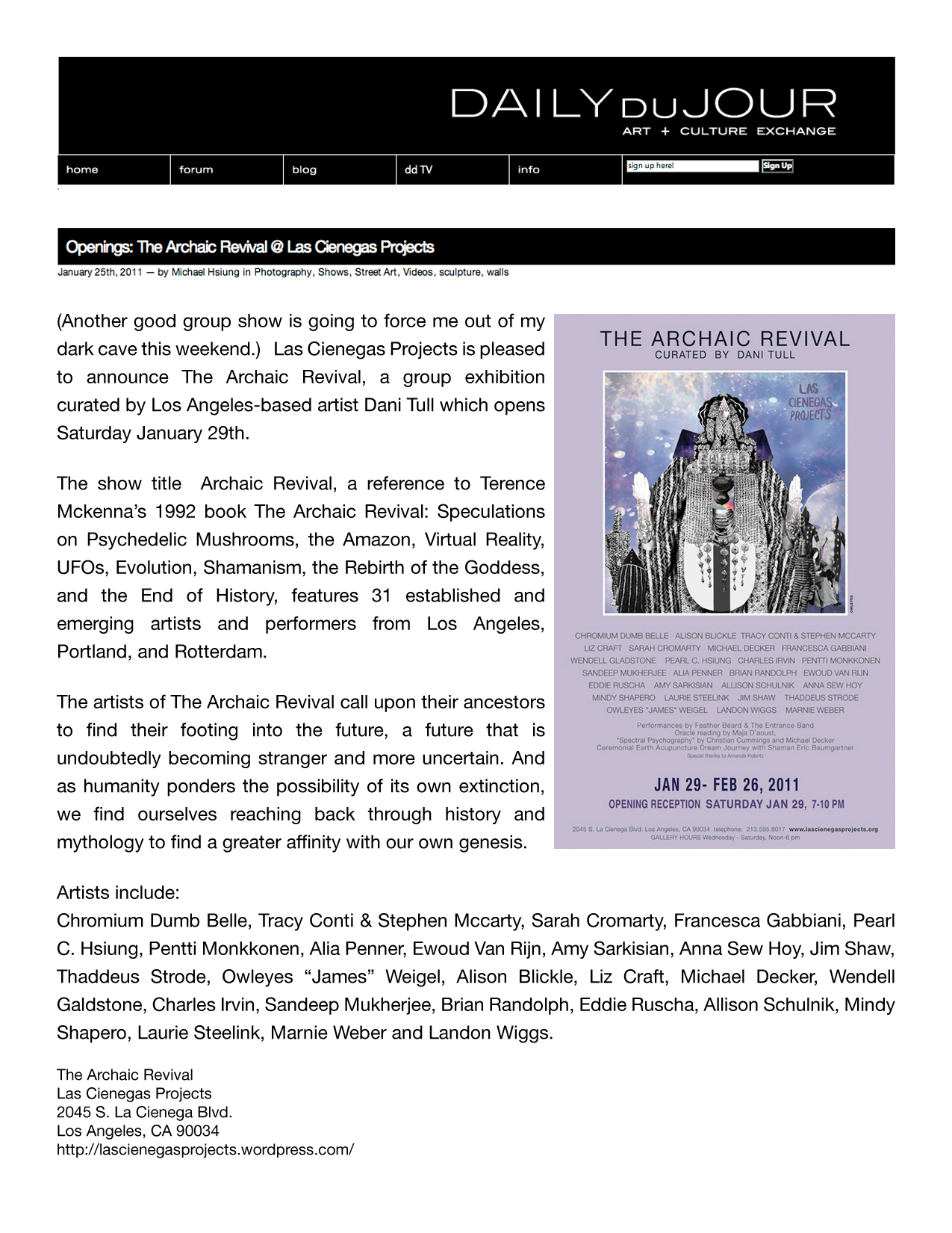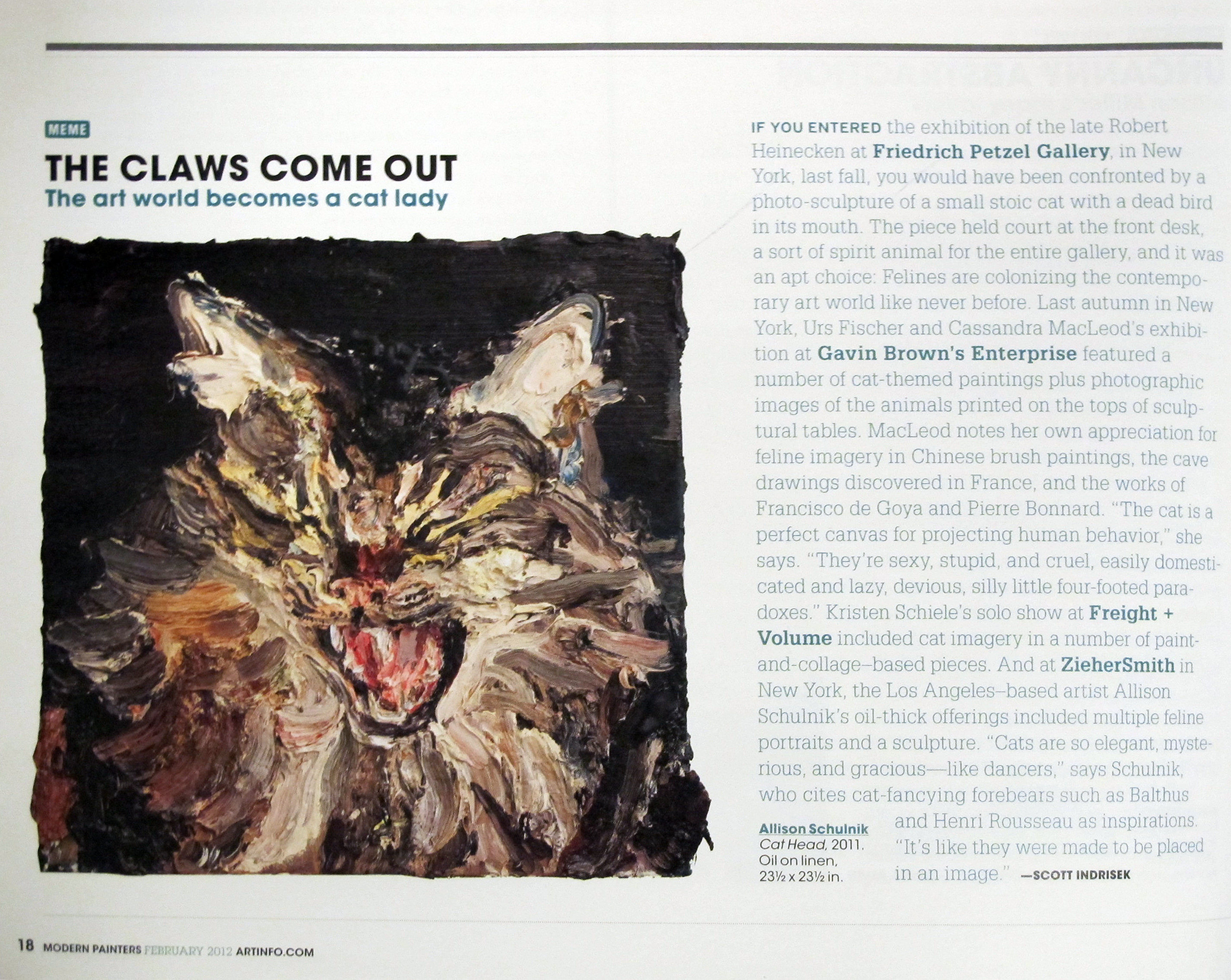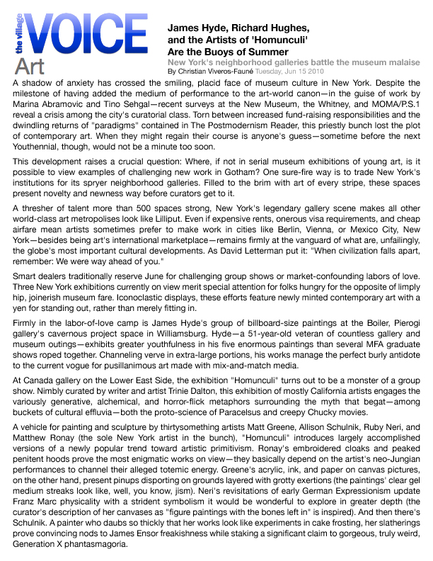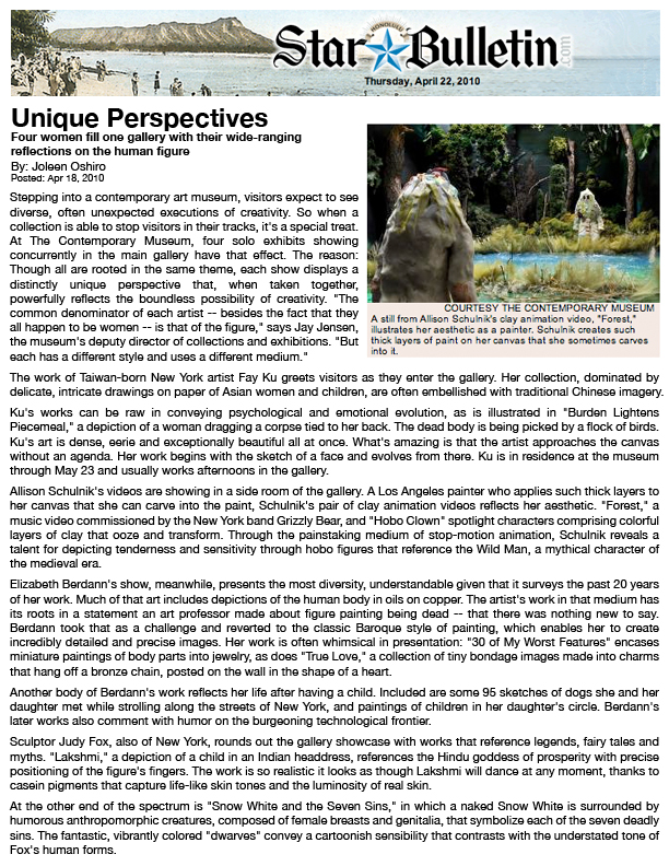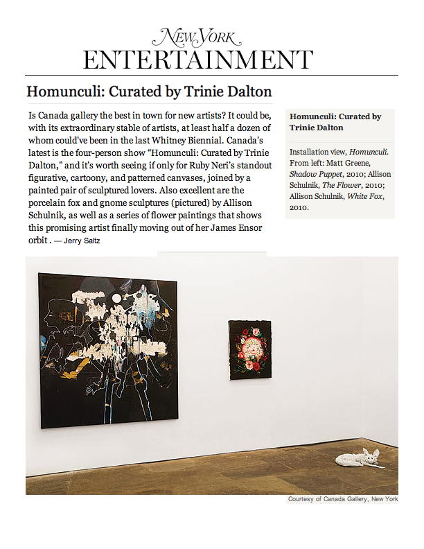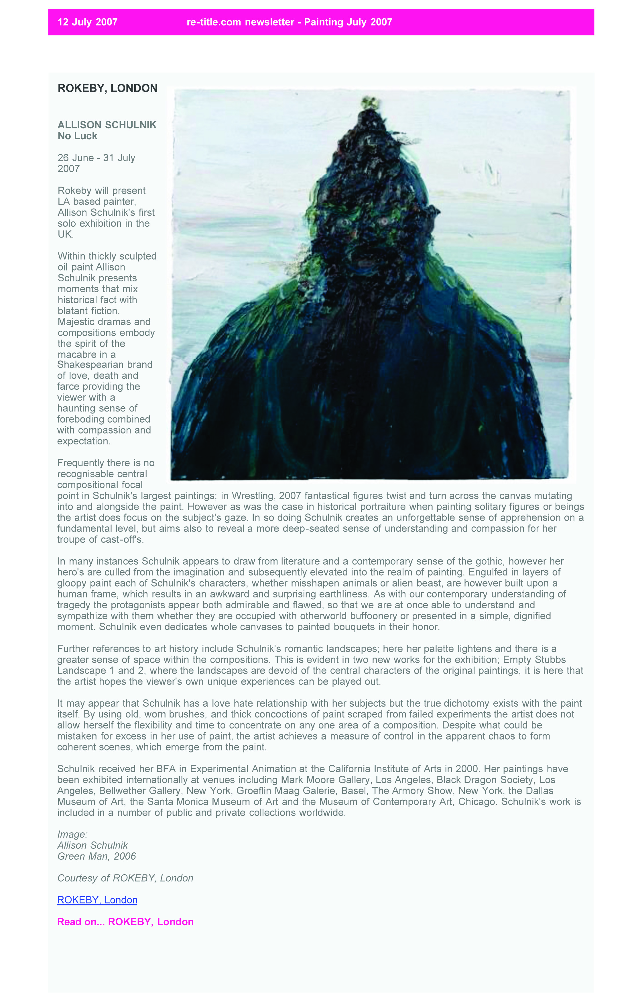 Solo exhibitions include the Wadsworth Atheneum Museum of Art, Hartford, CT; Laguna Art Museum, Laguna Beach, CA; Oklahoma City Museum of Art, OK; Nerman Museum of Contemporary Art, Overland Park, KS; Mark Moore Gallery, Los Angeles; ZieherSmith, New York, NY; and Galeria Javier Lopez & Fer Frances, Madrid. Schulnik's work is in the public collections of the Los Angeles County Museum of Art; Museum of Contemporary Art San Diego; Santa Barbara Art Museum; Museé de Beaux Arts (Montreal); Laguna Art Museum; The Crocker Art Museum; Wadsworth Atheneum Museum of Art; and The Albright-Knox Gallery; Marjorie Barrick Museum (University of Nevada Las Vegas)- to name but a few. She lives and works in Sky Valley, CA.
