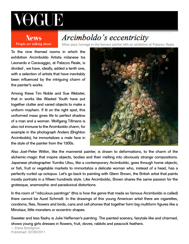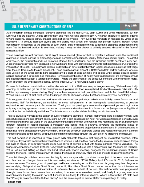 Akin to Magical Realism, Julie Heffernan's lush self-portraiture utilizes a myriad of art historical references to present a sensual interior narrative, a self-allegory whose half- hidden political agenda is the literal background of the paintings. The dark, Grimm fairy tale-like undercurrent transforms her aristocratic, operatic portraits into a contemporary vanitas or memento mori, acting as both a stylized fantasy and a Bosch-like warning.