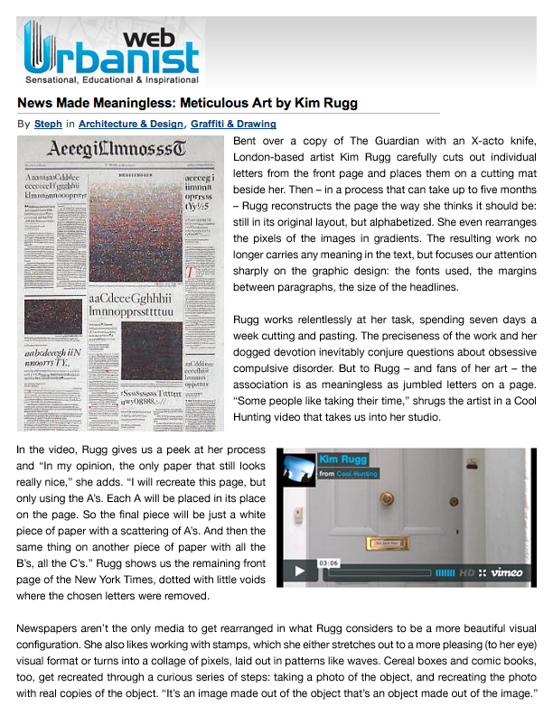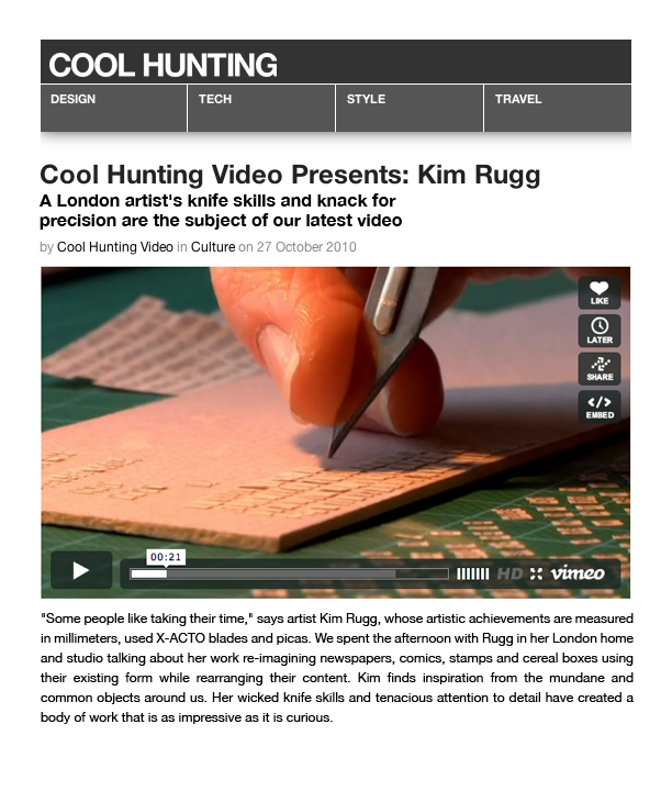 “Some people like taking their time," says Kim Rugg, whose artistic achievements are measured in millimeters, spent X-ACTO blades and picas. We spent the afternoon with Rugg in her London home and studio talking about her work re-imagining newspapers, comics, stamps, and cereal boxes using their existing form while rearranging their content. Kim finds inspiration from the mundane and common objects around us. Her wicked knife skills and tenacious attention to detail have create a body of work that is as impressive as it is curious.