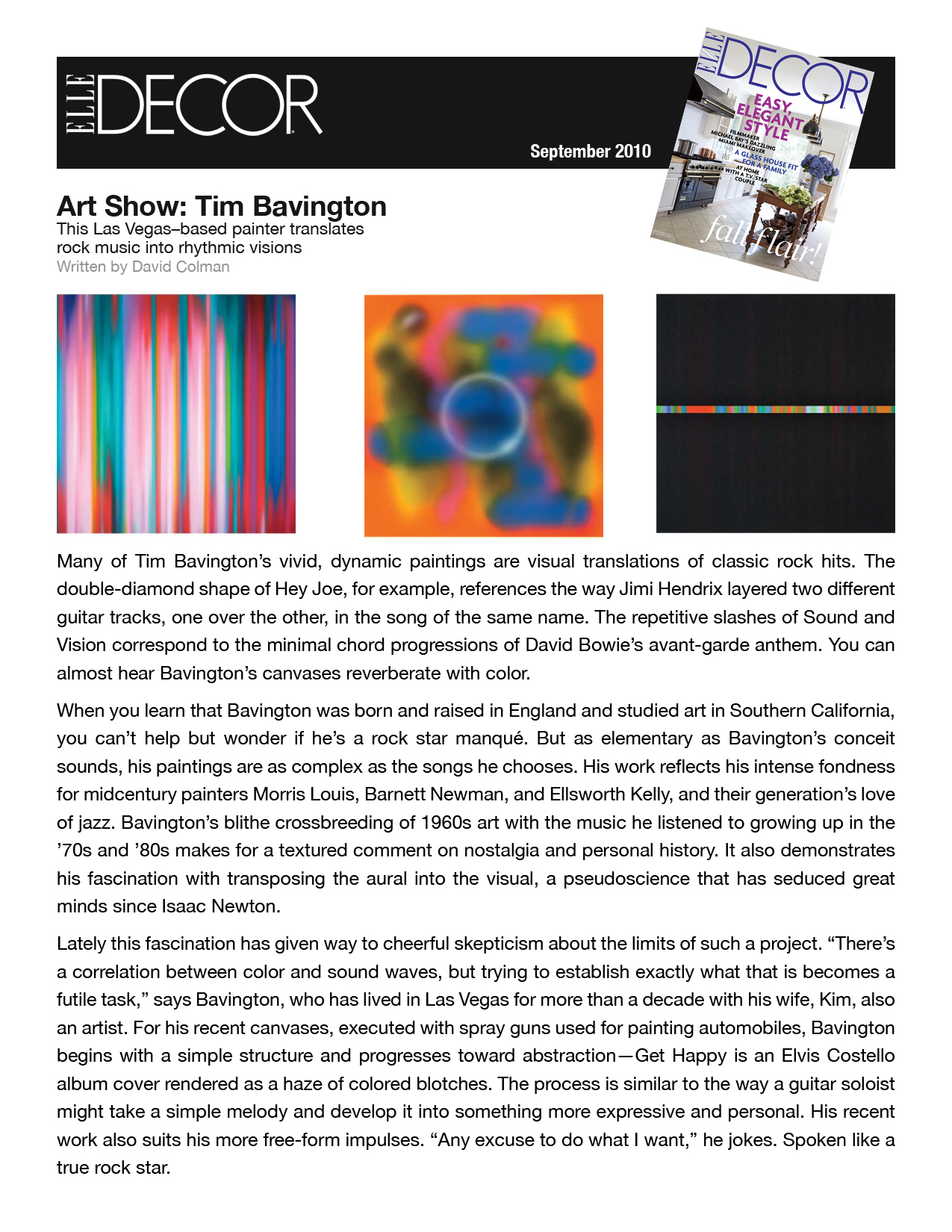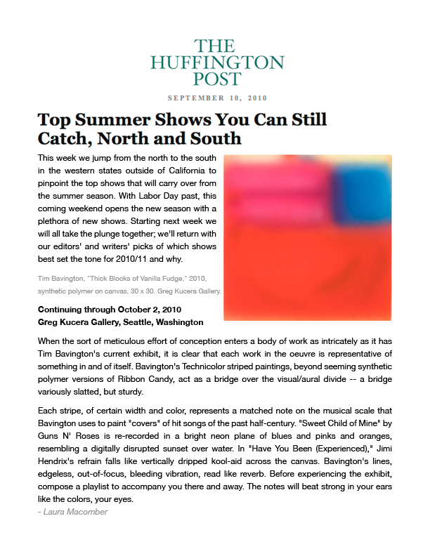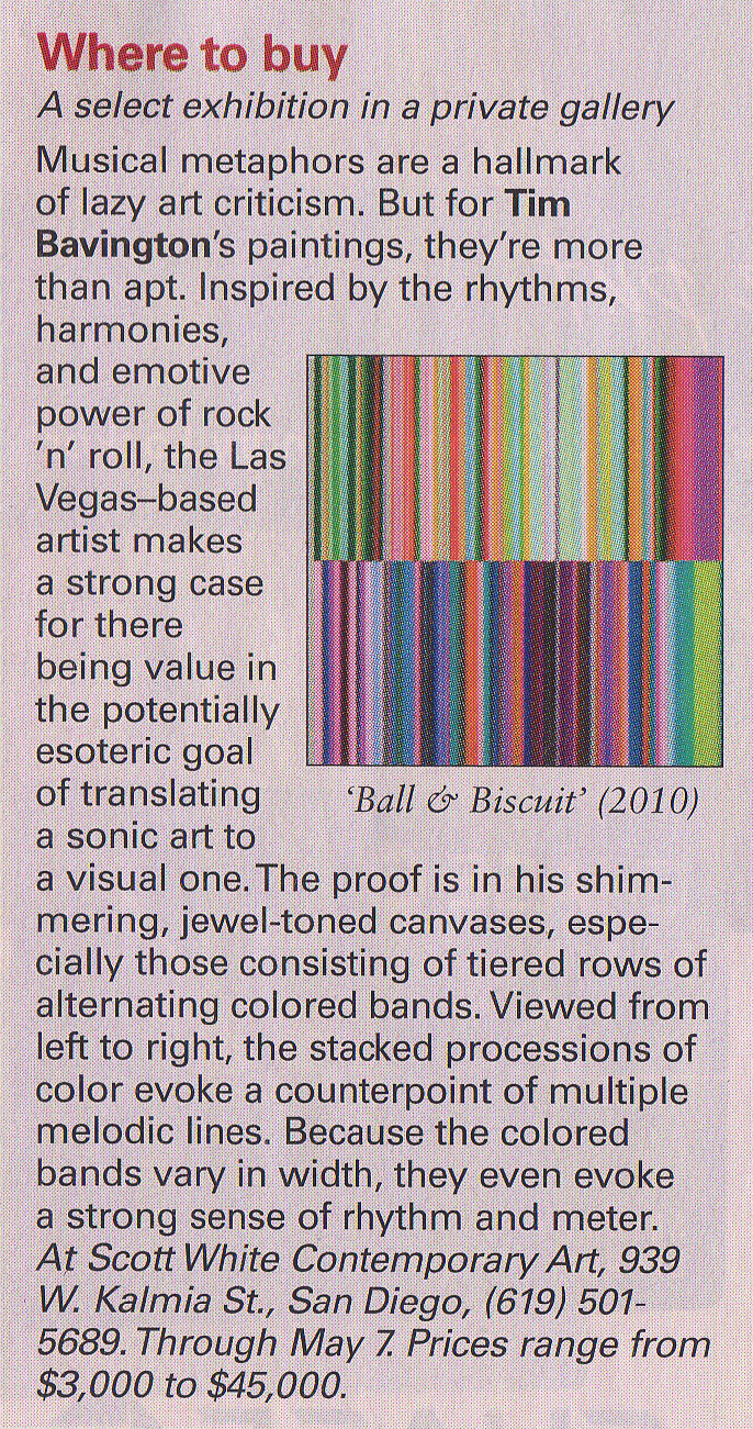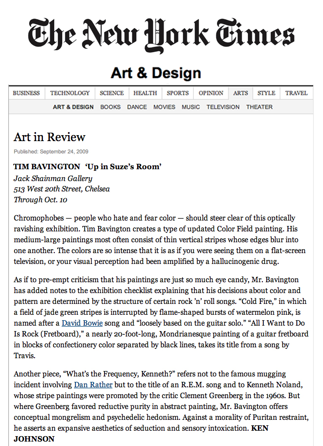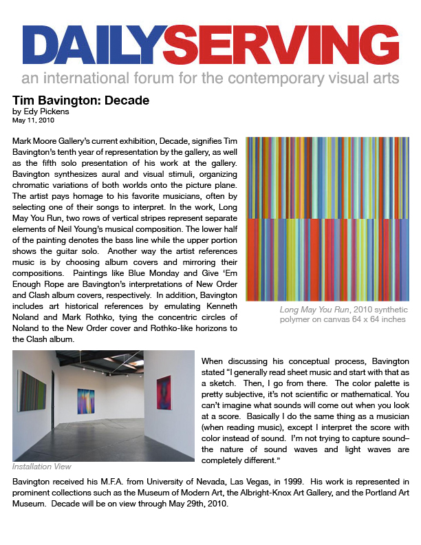 Music is the genesis of Tim Bavington's paintings. Through synthetic polymer paint, Bavington acts as a translator between the aural and the visual as he transforms guitar solos, melodies and bass lines into vertical bands of color. Tracks from bands such as The Beatles, The Jam, Oasis, and The Rolling Stones become vibrant bands of color, and bridge compositional concepts between seemingly unlike disciplines. Although Bavington has a method that designates sound to color and composition, the paintings are not literal translations; they remain open to intuition and decision-making, allowing for a distinct artistic presence.
