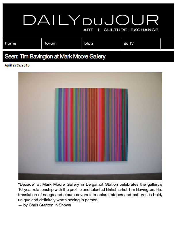 Music is the genesis of Tim Bavington's paintings. Through synthetic polymer paint, Bavington acts as a translator between the aural and the visual as he transforms guitar solos, melodies and bass lines into vertical bands of color. Tracks from bands such as The Beatles, The Jam, Oasis, and The Rolling Stones become vibrant bands of color, and bridge compositional concepts between seemingly unlike disciplines. Although Bavington has a method that designates sound to color and composition, the paintings are not literal translations; they remain open to intuition and decision-making, allowing for a distinct artistic presence.
