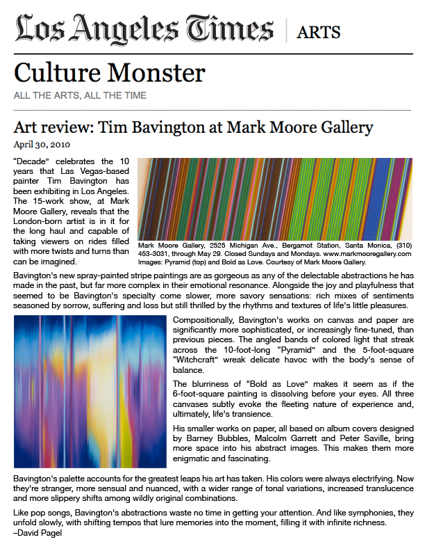 Tim Bavington (b. 1966, England) received his BFA from the Art Center (CA) before making the permanent move to Las Vegas, where he completed his MFA at the University of Nevada, Las Vegas (NV). His work is included in the public collections of Fredrick R. Weisman Collection (CA), Crocker Art Museum (CA), Honolulu Art Museum (HI), Albright-Knox Art Gallery (NY), Creative Artists Agency (CA), Joslyn Art Museum (NE), Museum of Contemporary Art, San Diego (CA), Portland Art Museum (OR), United Talent Agency (CA), Vivendi Universal (CA), Palm Springs Art Museum (CA), Denver Art Museum (CO), The Museum of Modern Art (NY), Nora Eccles Harrison Museum of Art, Utah State University (UT) and the McNay Art Museum (TX). He has exhibited at LeeAhn Gallery (Daegu), Jack Shainman Gallery (NY), Galerie Jean-Luc & Takako Richard (Paris), Space Gallery (London), Museum of Fine Arts (MA), Laguna Art Museum (CA), Museo de Arte Contemporaneo de Buenos Aires, and the Texas Fine Arts Center (TX) among others.