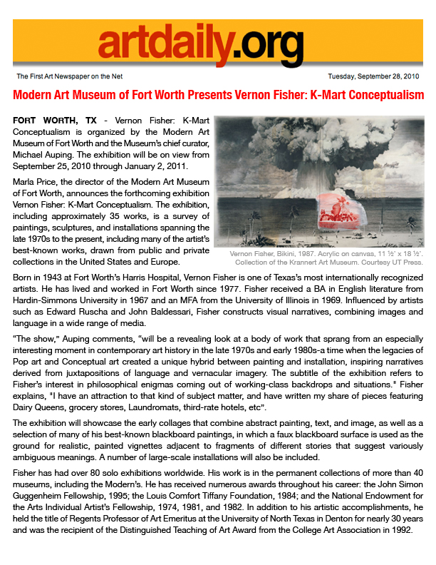 Vernon Fisher was born in 1943 in Fort Worth, Texas. He studied English literature at the Hardin-Simmons University, where he received a BA in 1967. Vernon got his MFA in 1969, from the University of Illinois. As a true Fort Worth child, Fisher was spent his entire life in his hometown, where he enjoyed appreciation as one of the Texas’s most internationally recognized artists.
